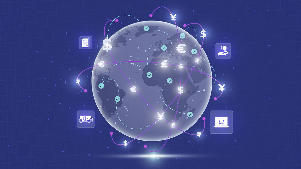Computer generated view of digital earth with connection points to finance icons