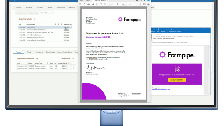 Formpipe’s software uses the standard data in Temenos’ product suite to create perfectly designed and branded digital and hard copy documentation, across your entire banking network. With real-time distribution to customers & automatic digital archiving, documents and data can be accessed quickly and securely through the Temenos UI using Formpipe’s easy integrations or via mobile app / internet banking.