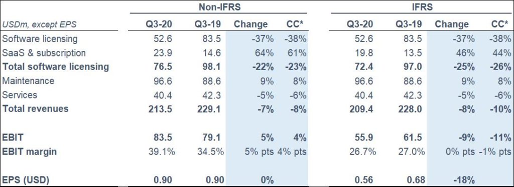 Non-IFRS total software licensing revenue was USD 76.5m for the quarter, a decrease of 22% vs. Q3 2019.