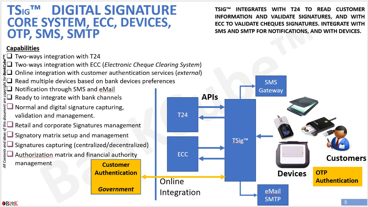 TSig™ is fully integrated with ECC to verify and authorize customer signatures based on defined signatory matrix and related rules assigned to the cheque signature authorization. TSig™ can adapt to the bank process of cheque signatures capturing, verification, and authorization.