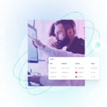 A focused man examines data on a computer screen. In the foreground, an overlaying invoice table shows transactions with various amounts and statuses.