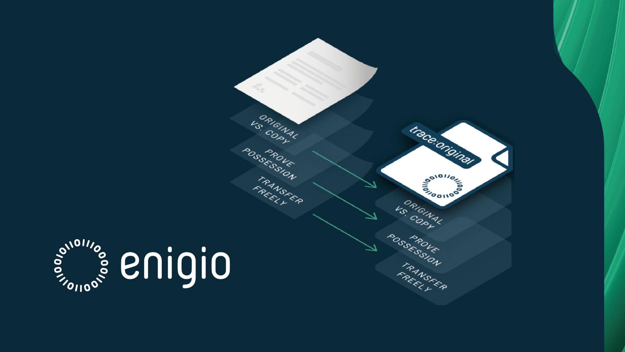 Digital document transformation illustration with arrows moving from a paper document to a digital form labeled "trace:original," highlighting copy verification and free transfer. Enigio logo included.